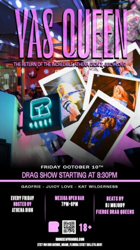 R House Wynwood and Athena Dion present “YAS QUEEN” — your ultimate Friday night drag takeover. The drag show starts at 8:30PM.