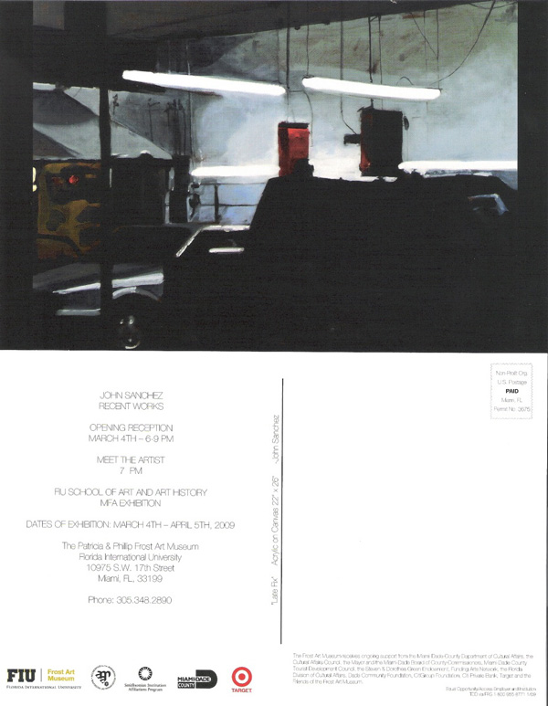 Frost Art Museum is having an opening for John Sanchez’s show of new paintings on Wednesday, March 4, 6-9pm. On view through April 5th, this exhibition is Sanchez’s Florida International University Masters of Fine Art show. For directions: http://thefrost.fiu.edu/map.ht. Frost Art Museum will have a brochure available about Sanchez’s work.
