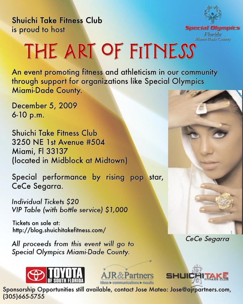 On Saturday, December 5th from 6pm-10pm, the Shuichi Take Fitness Club is proud to host The Art of Fitness. The event aims to celebrate and promote fitness and athleticism in our community by showing its support for Special Olympics Miami-Dade. Our hope is to raise $10,000 that will help maintain some of the programs and services that Special Olympics Miami-Dade provides to our communities.