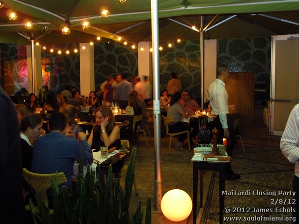 Maitardi on Wednesday, February 8, 2012. Maitardi hosted its final celebration with samplings from Graspa Group’s sister restaurant which include Salumeria 104, Soyka, TiramesU, Spris, Van Dyke Café they also had complimentary Prosecco by Segafredo L’Originale on Lincoln Road. Throughout the evening  we enjoyed artists from the MaiArt series, musicians from Noche Latina and MaiMusic, resident and visiting DJs, sponsors, partners and patrons who supported Maitardi since its opening.