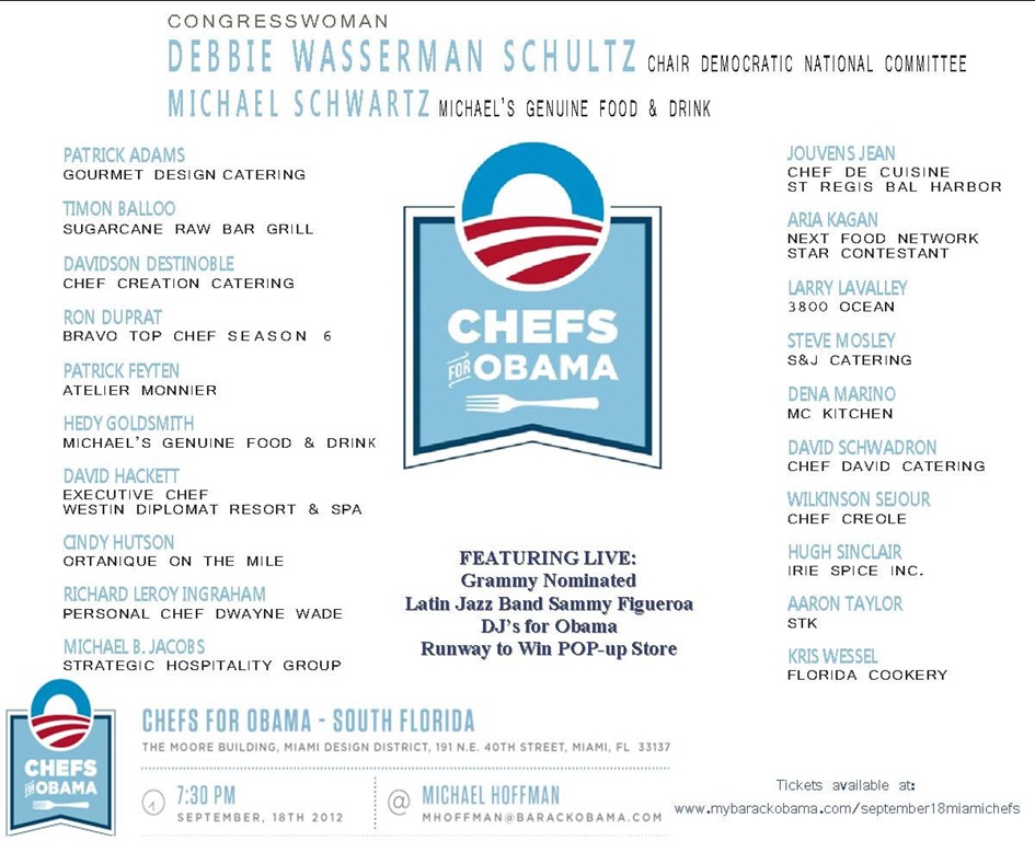 Chefs for Obama is an event highlighting Celebrity Chefs from across South Florida who support the re-election of President Barack Obama and Vice President Joe Biden.