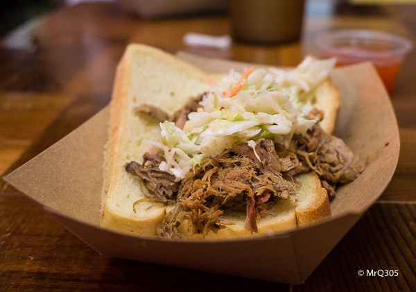 Pulled Pork Texas Toast with Cole Slaw is served on a simple cardboard tray but as simple as it sounds, it is every bit as good as good can get, they have a variety of sauces to enhance the flavor and the pork is moist and soft. If you are on the mood for barbecue, this is the place.