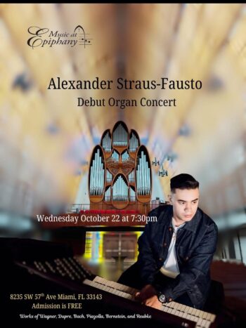 Alexander Straus-Fausto, a rising international talent and now a new voice in Miami’s music scene will be giving a celebratory organ performance on Wednesday, October 22 at 7:30pm at Church of the Epiphany. His program will be titled ‘Drama, Discipline and Divinity”, showcasing the organ as few have heard it before: the fire of an orchestra, the intimacy of a single voice, and the resonance of an entire building coming alive. It promises to be a truly world-calss evening of music.