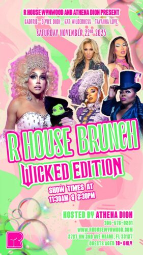Get ready to celebrate in style at R House Wynwood’s Wet & Wild Drag Brunch this Saturday, November 22nd! Hosted by Athena Dion, this electric brunch features two iconic showtimes at 11:30AM and 2:30PM.