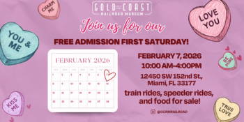 The Gold Coast Railroad Museum is hosting their monthly 1st Free Satruday on February 7, 2026. Fall in love with our rail cars, dive into history, and enjoy our freshly grilled hotdogs and burgers.