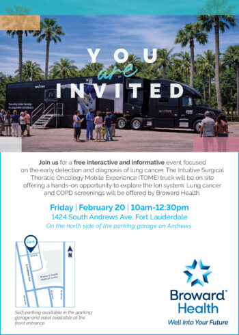 Join us for a free interactive and informative event focused on early detection and diagnosis of lung cancer. The Intuitive Surgical Thoracic Oncology Mobile Experience (TOME) truck will be on site offering hands-on opportunity to explore the Ion system. Lung cancer and COPD screenings will be offered by Broward Health.