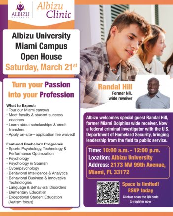 Discover a top affordable private accredited university in South Florida! Albizu University will be hosting an Open House at its Miami Campus, 2173 NW 99th Ave., in Doral on Saturday, March 21 from 10 a.m. to 12:30 p.m. The event is free and open to the public.