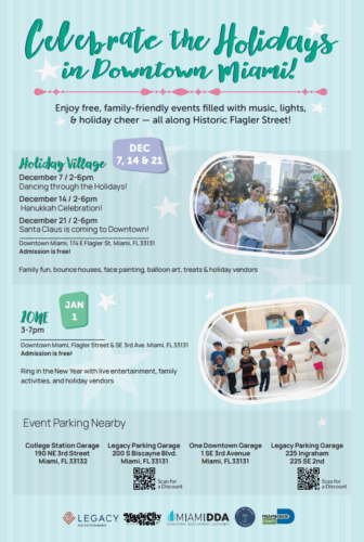 The Miami Downtown Development Authority will host its free Holiday Village on Flagler series on December 7, 14 and 21 from 2 to 6 p.m. at 174 E Flagler Street. Each Sunday pop-up features family friendly activities including bounce houses, face painting, balloon art, sweet treats, holiday vendors, photo ops and themed programming.