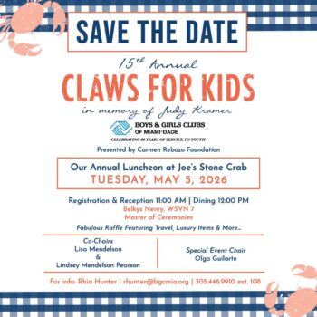 Crack open opportunities for Miami-Dade area youth! Boys & Girls Clubs of Miami-Dade will celebrate the 15th Annual “Claws for Kids” fundraising luncheon on Tuesday, May 5, at Joe’s Stone Crab, honoring the legacy of longtime Board member Judy Kramer while raising critical funds to support youth programs serving thousands of children across Miami-Dade County.